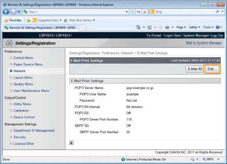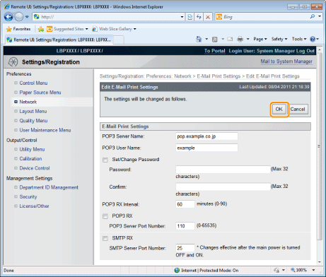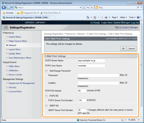 [POP3 RX Interval] | Set the interval for automatically connecting to the server that receives e-mail in minute units. Receive e-mail at specified intervals and print it automatically. You can set from 0 (minutes) to 90 (minutes). When it is set to 0, it does not automatically receive e-mail from the server. When it is set to 0 and when you want to connect to the server before it automatically connects to the server that receives e-mail, you can receive e-mail manually. |