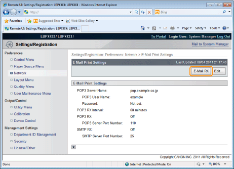 Click [E-Mail RX] on the right side of [E-Mail Print Settings].