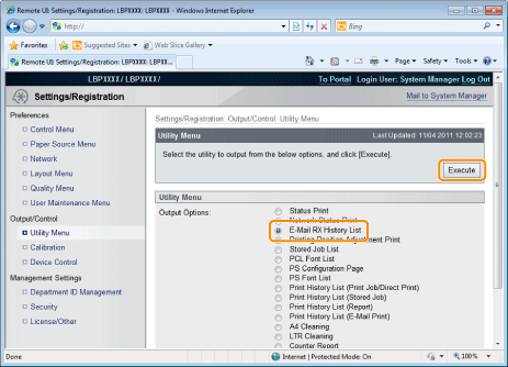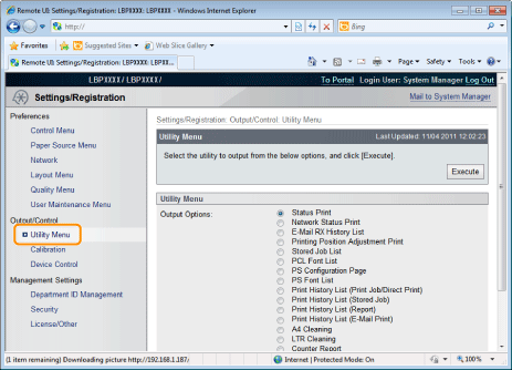 Click [Utility Menu] under [Output/Control] in the [Settings/Registration] menu.