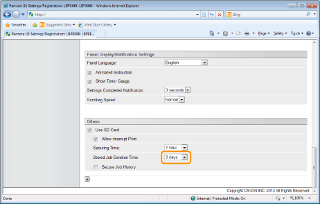 Stored jobs can be deleted automatically by setting a length of time to pass between storing of the jobs and their deletion.