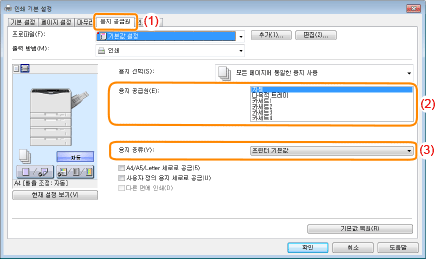 (1) | [용지 공급원] 탭이 표시되게 합니다. |