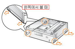 <프린터가 이미 설치되어 있는 경우>프린터를 설치한 후 프린터에 용지 급지대를 설치할 경우에는 잠시 프린터를 적절한 장소로 옮겨 놓으십시오.  " 프린터 운반하기" 용지 급지대를 설치할 때의 주의사항에 관한 자세한 내용은 " 주의(프린터 설치)"를 참조하시기 바랍니다. |