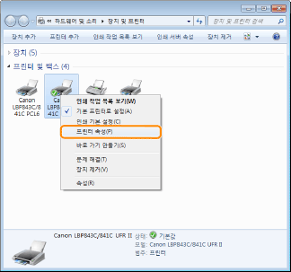 프린터의 아이콘을 마우스 오른쪽 버튼으로 클릭한 다음, 팝업 메뉴에서 [프린터 속성] 또는 [속성]을 선택합니다.