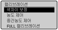 ]를 사용하여 [색차이 보정], [농도 제어], [중간농도 제어] 및 [FULL 캘리브레이션]에서 조정하고자 하는 항목을 선택한 후 [OK]를 누릅니다.