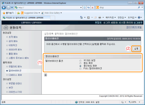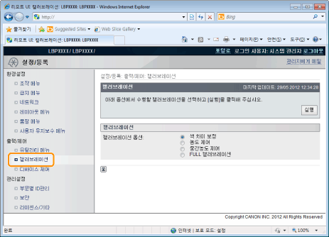 보정 실행 시 주의 사항보정을 빈번히 실행하면 토너 카트리지 수명에 영향을 미칠 수 있습니다. 토너가 토너 카트리지에 남았는지 확인한 후 보정을 실행합니다.