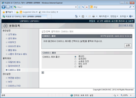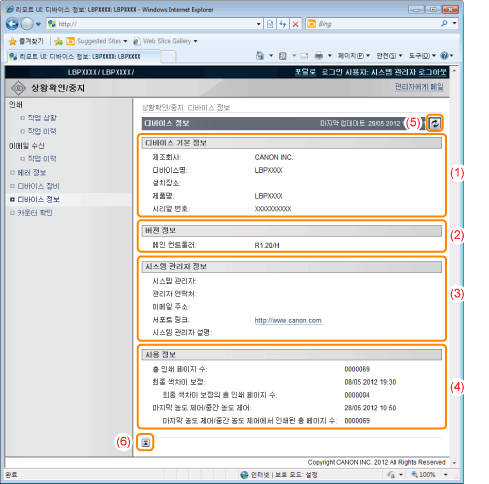 (5) | 업데이트 버튼최신 상태를 표시하도록 [디바이스 정보] 페이지를 새로고침합니다. |