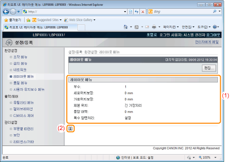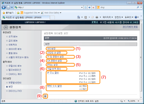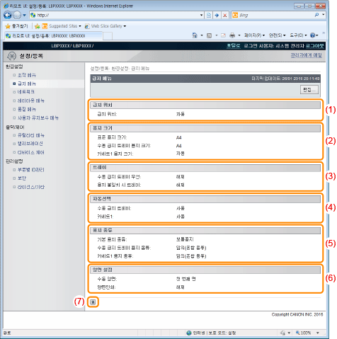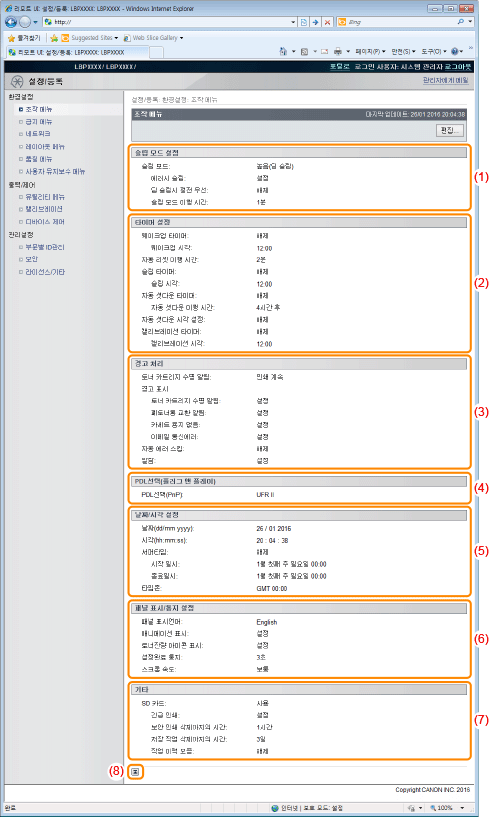 (1) | [관리설정]프린터에 대한 일반 정보를 표시합니다. | ||