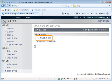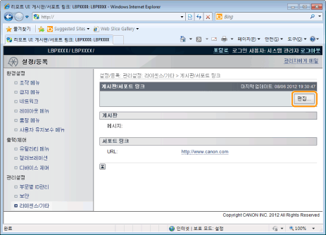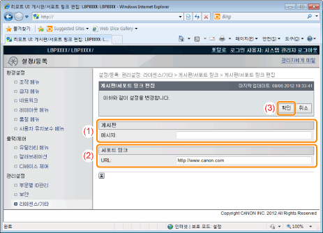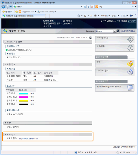 리모트 UI의 포털 페이지에 있는 게시판에 관리자로부터의 메시지를 게시할 수 있습니다. 또한 포털 페이지 지원 링크에 프린터 정보 링크를 연결하여 필요한 경우 리모트 UI에서 접근할 수 있게 할 수 있습니다.