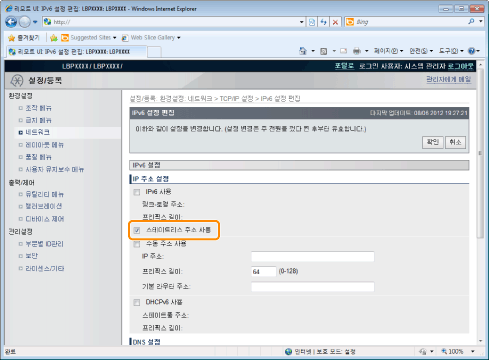 비상태 주소 보유[스테이트리스 주소 사용] 확인란을 선택하고 프린터가 재기동하면, 비상태 주소가 자동으로 표시됩니다. 이 비상태 주소는 프린터의 전원이 꺼지면 삭제됩니다. |