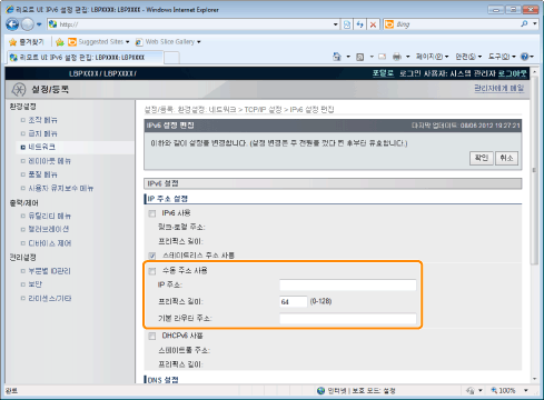 [IP 주소] 및 [기본 라우터 주소]에 입력할 수 없는 주소"ff"로 시작하는 주소(멀티캐스트 주소) "0:0:"으로 시작하는 주소 |