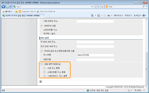 DNS 동적 업데이트DNS 동적 업데이트는 DNS 서버에 장치의 IP 주소, 호스트 이름으로 지정된 이름, 도메인 이름을 자동으로 추가하는 기능입니다. 이 기능은 Dynamic DNS 서버가 사용되고 있는 환경에서만 사용이 가능합니다. DNS 동적 업데이트 기능을 사용하는 경우DNS 서버의 IP 주소, 호스트 이름, 도메인 이름을 설정할 필요가 있습니다. |