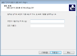 프린터의 IP 주소를 설정하는 방법에 따라 포트 설정 과정에서 표시되는 다음 화면의 [프린터 이름 또는 IP 주소]에 입력해야 하는 값이 달라집니다.
