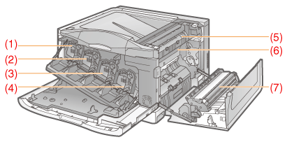 (3) | C(청록색) 토너 카트리지 슬롯 | ![]() | (7) | 보조 전사 롤러 |