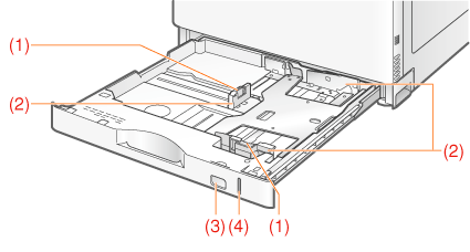 (1) | 잠금 해제 레버 | ![]() | (2) | 용지 가이드 | ![]() | (3) | 용지 크기 가이드 | ![]() | (4) | 용지 수량 램프 |