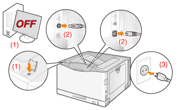알코올, 페인트 용해제 또는 기타 가연성 물질 근처에 프린터를 설치하지 마십시오. 가연성 물질이 프린터 내부의 전기 부품과 접촉하면 화재나 감전이 발생할 수 있습니다. 다음 품목들은 프린터 위에 올려놓지 마십시오. 목걸이 및 기타 금속물 컵, 꽃병, 화분 및 물이나 액체로 채워진 기타 용기 이러한 품목들이 프린터 내의 고전압 부분과 접촉하면 화재나 감전이 발생할 수 있습니다. 이러한 품목들이 프린터 안으로 떨어지거나 엎질러질 경우, 즉시 전원 스위치를 끄고(1) 연결되어 있는 인터페이스 케이블을 분리합니다(2). 그런 다음 AC 전원 콘센트에서 전원 플러그를 뽑고 (3) 가까운 저희 회사 대리점에 문의하십시오. ![]() 옵션의 액세서리를 설치 또는 제거할 경우 반드시 프린터 전원을 끈 다음 프린터에서 모든 인터페이스 케이블과 전원 코드를 분리하십시오. 그렇지 않을 경우 전원 코드와 인터페이스 케이블이 손상돼 화재나 감전의 원인이 될 수 있습니다. |