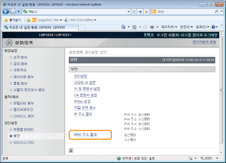 웹 브라우저(리모트 UI)를 사용하여 MAC 주소로 접속할 수 있는 사용자를 제한할 수 있습니다.