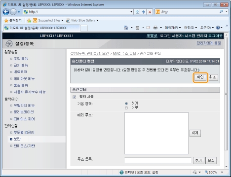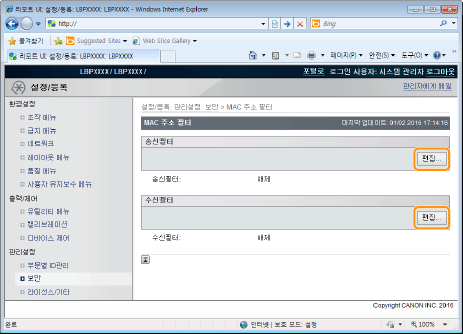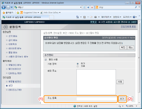 MAC 주소를 지정하려면 항상 리모트 UI를 사용하십시오. 제어판을 사용하면 설정과 해제 간의 주소 필터 설정 전환만 수행할 수 있습니다.