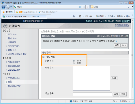 [송신필터] | 프린터에서 데이터를 전송하는 것을 제한합니다. |