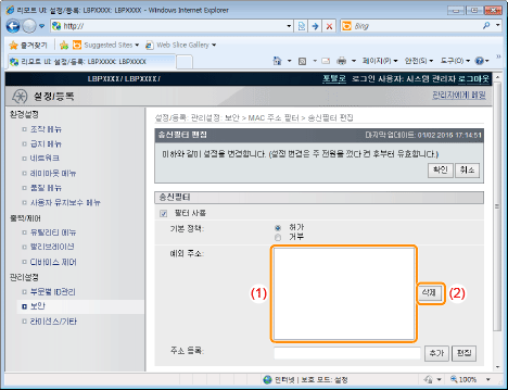 설정한 MAC 주소를 삭제하는 경우(1) | 삭제할 MAC 주소를 선택합니다. | (2) | [삭제]를 클릭합니다. |
