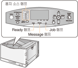 Job 램프가 점등되어 있습니다. | 프린터가 작동 중입니다. 잠시 기다려 주십시오. 프린터가 잠시 동안 인쇄를 실행하지 않는 경우에는 인쇄 데이터 출력 또는 소프트 리셋을 실행해 주십시오. "작업 취소" |