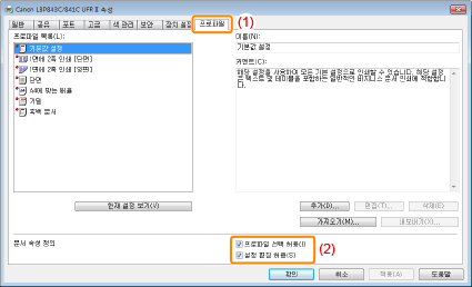 [프로파일 선택 허용] 및 [설정 편집 허용] 확인란의 선택을 해제한 경우에는 "프로파일"의 선택 및 편집이 제한됩니다.