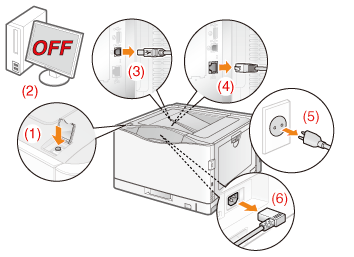 USB 케이블* | (2) 컴퓨터의 전원을 끕니다. (3) 프린터에서 케이블을 분리합니다. |