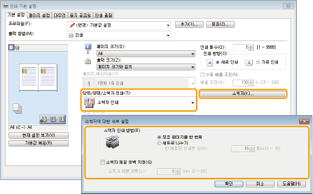 이 기능은 [마무리] 탭에서도 설정할 수 있습니다. 소책자 인쇄를 실행할 경우 [기본 설정]/[마무리] 탭에서 [한 부씩 인쇄/페이지별 인쇄] 옵션을 지정할 수 없습니다. 화면은 운영체제와 프린터 드라이버의 종류 및 버전에 따라 다를 수 있습니다. |