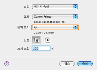 사용 중인 프린터 모델에 따라 선택한 용지 크기에 맞는 최적 비율로 문서를 확대하지 못할 수 있습니다. Mac OS X 10.5.x에서는 사용 중인 응용 프로그램에 따라 [페이지 설정] 대화상자가 표시되지 않을 수도 있습니다. 이 경우에 해당하면 [프린트] 대화 상자에서 페이지 크기, 페이지 방향 및 배율을 지정할 수 있습니다. [프린트] 대화 상자를 표시하는 방법에 대한 자세한 내용은 " 인쇄"를 참조해 주십시오. 화면은 운영체제와 프린터 드라이버의 종류 및 버전에 따라 다를 수 있습니다. |