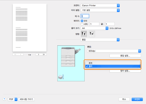 [컬러 모드]에서 [흑백] 또는 [컬러]를 선택합니다.