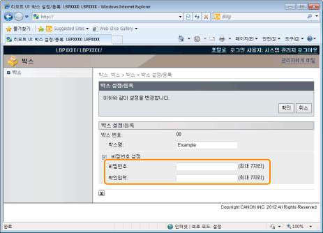 (2) | 지정하려는 비밀번호를 [PIN 번호]에 입력하고, [PIN 번호]에 입력한 동일한 번호를 [확인입력]에 입력합니다. |
