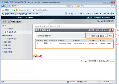 (1) | 显示切换选择要显示的作业历史记录。列表中仅显示所选类型的作业历史记录。 [打印作业/直接打印] [存储作业] (仅 LBP843Cx) [报告] [电子邮件打印] |