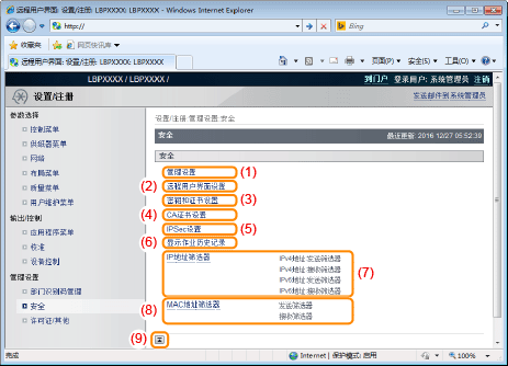 (5) | [IPSec设置] (仅 LBP843Cx)显示 IPSec 安全策略列表。