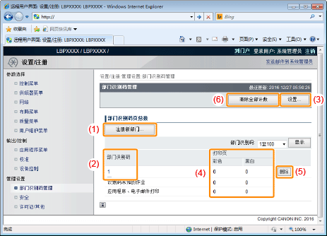 (5) | 删除所选部门(只有用管理员模式登录才显示。) 如果单击所要删除部门 ID 右侧的 [删除],将删除所选的部门 ID。 |