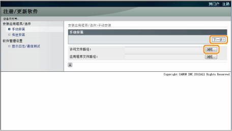 单击 [浏览] → 选择要安装的许可证文件和应用程序文件 → 单击 [下一步]。