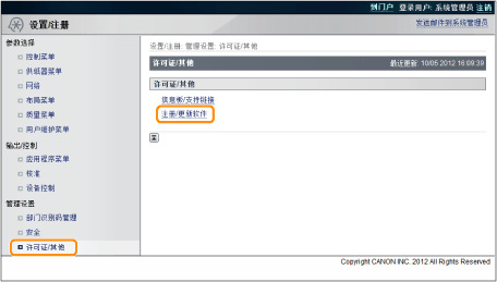 从远程用户界面首页单击 [设置/注册] → [许可证/其他] → [注册/更新软件]。