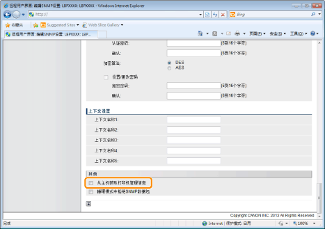 (5) | 根据需要,在睡眠模式下进行拒绝接收 SNMP 数据包的设置。 如果选中 [睡眠模式中拒绝SNMP数据包] 复选框,则可能无法从佳能软件(iW 系列)或使用 SNMP 协议的应用程序访问打印机。 ![]() | ||||||||||||