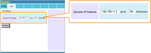 * | 该示例显示路由器使用 DHCP 分配的 IP 地址范围从 192.168.11.2 至 192.168.11.65,分配一个 IP 地址必须在 192.168.11.66 至 192.168.11.254 的范围内。 |