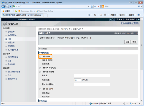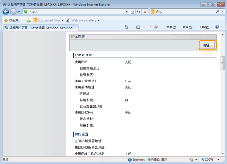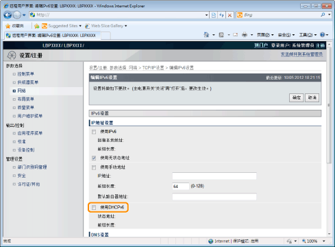 (3) | 设置 [主机名] 和 [域名]。 选中 [使用IPv4主机名/域名] 复选框,使用与 IPv4 相同的主机名和域名,打印机重新启动后,自动设置通过 IPv4 设置的主机名和域名。 使用与 IPv4 不同的主机名和域名时,输入 [主机名] 和 [域名]。最多可以输入 47 个字母数字字符。 [域名] 输入示例:“example.com” |