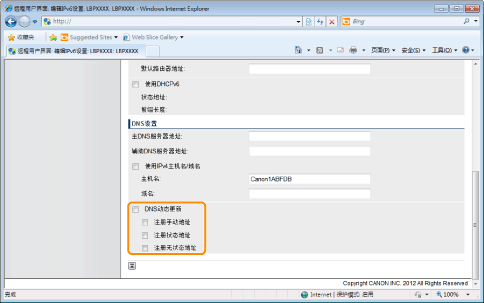 DNS 动态更新DNS 动态更新是自动将设备 IP 地址和指定为主机名和域名的名称添加到 DNS 服务器的功能。 该功能可以在使用动态 DNS 服务器的环境下使用。 使用 DNS 动态更新功能时需要设置 DNS 服务器的 IP 地址、主机名和域名。 |