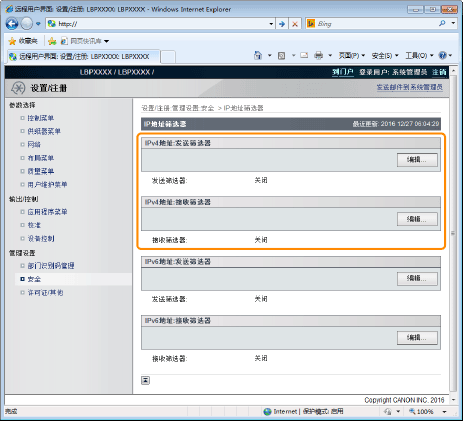 单击 [IPv4地址:发送筛选器] 或 [IPv4地址:接收筛选器] 下的 [编辑]。