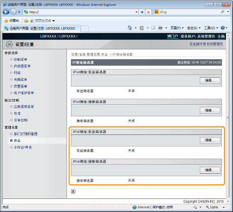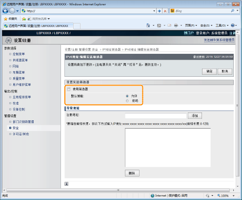 单击 [IPv6地址:发送筛选器] 或 [IPv6地址:接收筛选器] 下的 [编辑]。