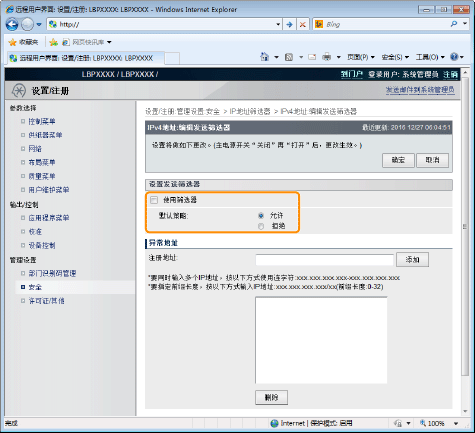 如果选中 [拒绝],只能从 [异常地址] 栏中输入的用户(客户端)传输或打印。
