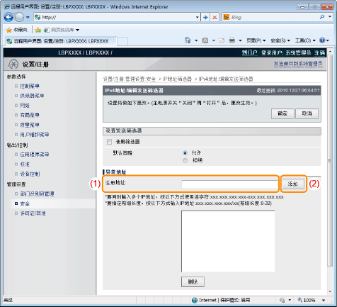 (2) | 单击 [添加]。 | 可最多设置 16 个 IP 地址(使用 [注册地址] 指定的 16 组 IP 地址)。 |