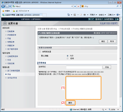 在 [前缀长度] 中输入“0”时所有 IP 地址成为拒绝或允许的目标。 在 [前缀长度] 中输入“32”时打印机 IP 地址成为拒绝或允许的目标。 删除设置的 IP 地址时(1) | 选择要删除的 IP 地址。 | (2) | 单击 [删除]。 |