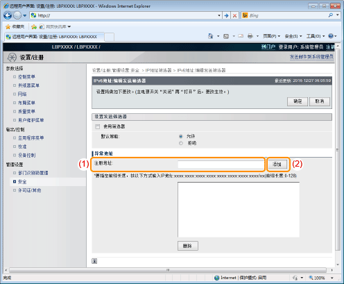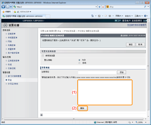 在 [前缀长度] 中输入“0”时所有 IP 地址成为拒绝或允许的目标。 在 [前缀长度] 中输入“128”时打印机 IP 地址成为拒绝或允许的目标。 删除设置的 IP 地址时(1) | 选择要删除的 IP 地址。 | (2) | 单击 [删除]。 |
