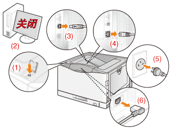 USB 电缆* | (2) 关闭计算机。 (3) 从打印机上拔下电缆。 |