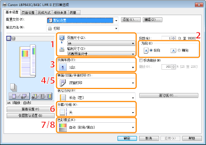 1.输出纸张尺寸 | 可选择从打印机实际输出的纸张尺寸(请参阅“缩放文档”)。 | 2.打印方向 | 设置相对于纸张方向的打印方向。 |