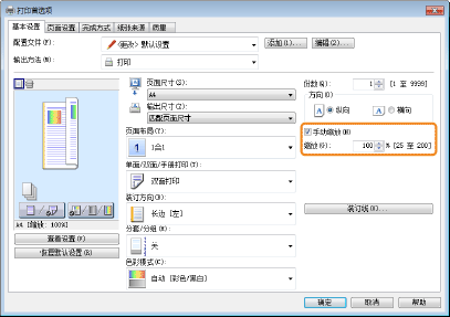该功能也可在 [页面设置] 选项卡中进行设置。 视选择的页面尺寸和使用的打印机型号而定,可能无法缩放文档。 某些应用程序的放大/缩小设置优先于打印机驱动程序的相应设置。 视使用的打印机型号而定,可能无法缩放文档到所选页面尺寸的最佳比率。 显示屏可能因操作系统以及打印机驱动程序的类型和版本而异。 |