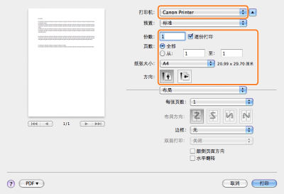对于 Mac OS X 10.7 及更高版本的用户,请单击屏幕底部的 [显示详细信息]/[隐藏详细信息] 以显示/隐藏选项。 对于 Mac OS X 10.5/10.6 用户,请单击 [打印机] 右侧的 [ ] 以显示/隐藏选项。如果无法在 [打印] 对话框的上部设置上述功能,请在 [份数与页数] 首选项窗格或 [页面设置] 对话框中显示并设置。 |