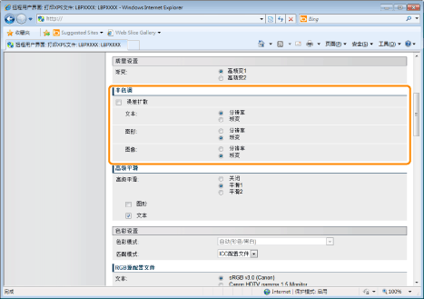 未选择 [误差扩散] 时,可从 [分辨率] 或 [渐变] 中选择 [文本]、[图形] 或者 [图像] 的半色调显示方法。